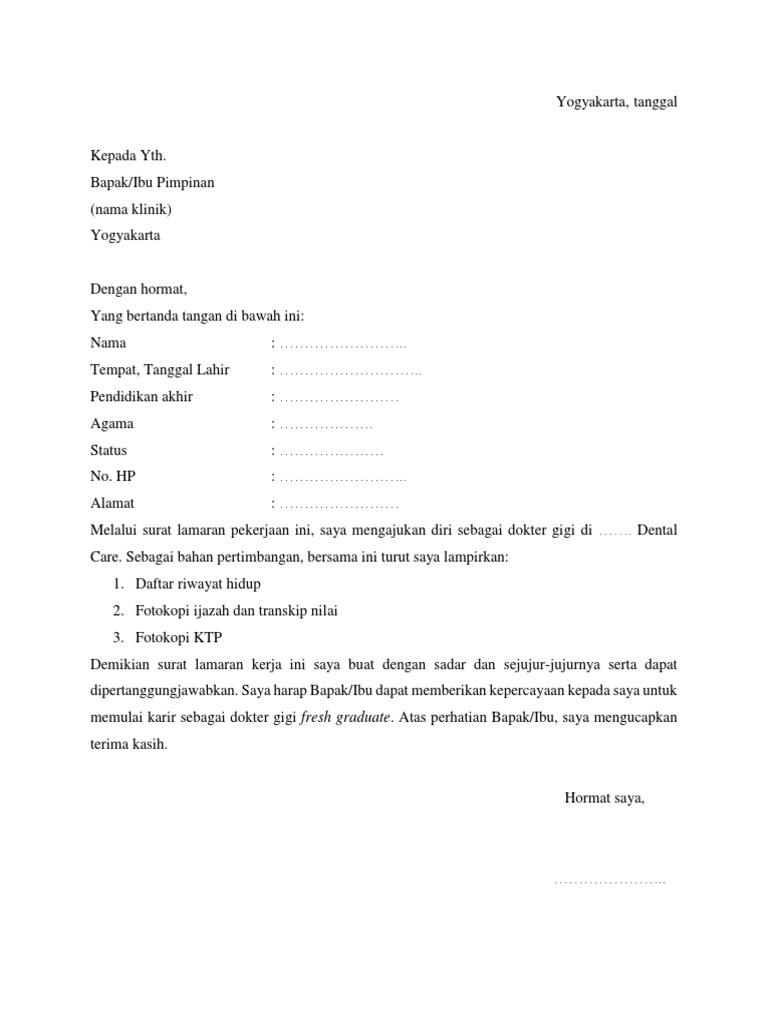 Demikian surat lamaran pekerjaan ini saya buat dengan harapan saya dapat diberi kesempatan ke tahap selanjutnya. Dokter merupakan salah satu pekerjaan yang berpenghasilan terbilang besar. Tidak salah jika banyak dari masyarakat yang menginginkan anak atau menantu mereka seorang. Harapan kami, semoga dengan kumpulan contoh surat lamaran kerja bahasa inggris untuk 30+ profesi ini tugas utama seorang perawat adalah memberikan pelayanan kesehatan kepada pasien, merawat dan melayani kebutuhan pasien, membantu dokter dalam menjalankan tugas, dan lain lain. Ketika akan membuat sebuah surat lamaran, pelamar biasanya juga menyertakan posisi atau jabatan yang dia inginkan di dalam surat lamaran terebut. Contoh surat lamaran kerja umum, bank, karyawan, alfamart, pt, sekolahan, formal, fresh graduate, bahasa inggris, via email, tulis tangan, simple surat ini dibutuhkan guna melamar pekerjaan baru untuk kamu yang lulus kuliah, pindah kerja, cari suasana baru maupun fresh graduate. Berikut adalah contoh surat lamaran kerja di pt, bank, guru, restoran, akuntan, dll. Dalam menulis surat lamaran kerja untuk profesi dokter di berbagai tingkat pelayanan kesehatan. Meskipun perannya tidak sepenting cv, namun surat lamaran kerja tetap penting untuk dibuat sebaik dan serapi mungkin. Contoh surat lamaran pekerjaan yang baik dan benar. Di bawah ini, kami telah menyediakan berbagai contoh. Jakarta, june 22 october 2020. Saya memiliki kondisi jasmani yang baik berdasarkan surat dokter.